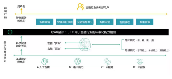 剛才講了有那么多場景,那容聯在做什么?容聯在2014年早期創業時致力于通訊云服務,我們提供的是通訊PaaS能力和SaaS服務,在2017年開始聚焦通訊智能化,我們構建起了通訊AI的中臺,以AI結合呼叫中心CC和統一通訊UC用于金融行業的標準化能力輸出,打造智能聯絡和協同中心,賦能金融場景,包括客服、營銷、催收、協同運營等。