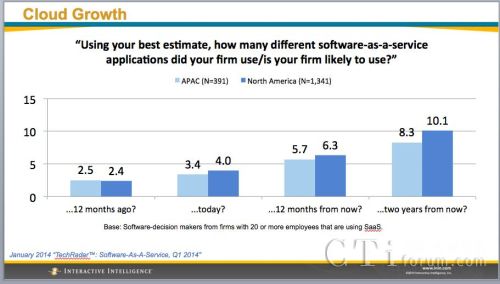 我們討論較多的是云計算的應(yīng)用。現(xiàn)在我們所看到的數(shù)據(jù)樣本是來自美國及亞太地區(qū)的數(shù)據(jù)統(tǒng)計。云應(yīng)用的市場占有率平均在40%以上,真的是特別高,基本上占據(jù)了接近一半的市場份額。去年云計算的平均增長率是2.5%,今年在亞洲的增長為3.4%,美國還要更高一點,達到了4%。按照這樣的發(fā)展速度,云應(yīng)用在亞太和北美地區(qū)的市場占有率將迅速提升。這就是我們要討論的呼叫中心的發(fā)展狀況。