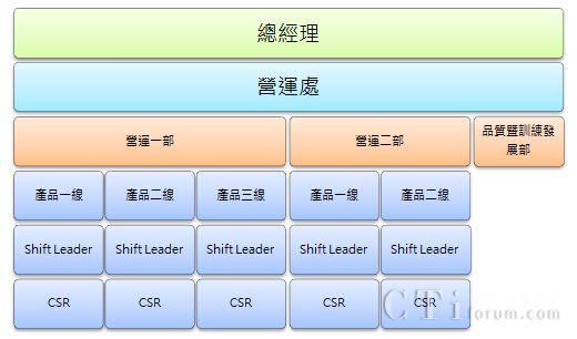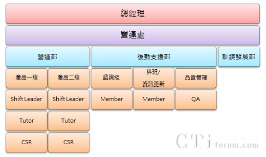 客服呼叫中心的營運管理,最主要為人的管理,而客服中心的業績則是人員工作績效與整體管理成績所展現的結果。因此,重要的是在技術規劃、系統維護及日常運作的同時,就能達到管理、監控、激勵員工等目的,以確保所有相關工作事項的履行。因此,客服中心的組織架構將是客服中心成功的關鍵之一。