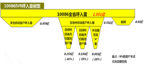 根據2013年的服務數據分析,客戶在漫游中撥打10086的服務量(如北京的客戶去深圳撥打10086)達0.551億/月,占10086整體呼入量(1.551億)的36%。而在這0.551億次呼叫中自動轉回歸屬地客戶占比為81%,選擇進入本地服務的客戶僅有10%,而9%的客戶在未選擇前就掛線了。