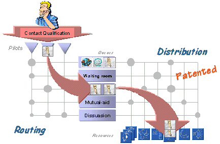 CCD智能呼叫分配器對經過呼叫特性鑒別并進入引導系統的呼叫,通過路由選擇矩陣進入不同的等待隊列,并由第二個雙向分配矩陣進行資源選擇或呼叫選擇。CCD先進的雙矩陣分配方式,通過其獨特的技巧和費用最低的路由算法來管理呼叫業務和資源,其性能超過當前工業標準。這種呼叫分配算法的顯著特點之一是恰到好處地分離路由選擇、資源分配以及選擇呼叫三個過程,使其既相對獨立,又靈活選擇。而傳統的“矢量分配”法的主要缺點是僅從呼叫的觀點描述處理,缺乏對正空閑的資源該做些什么加以控制。