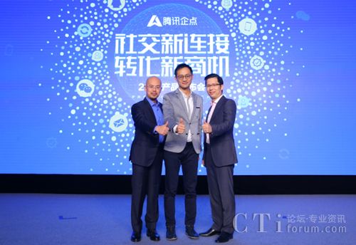 騰訊公司高級執行副總裁湯道生先生(中)、騰訊公司副總裁殷宇先生(右)以及騰訊公司企業產品部總經理譚毅先生(左)共同見證騰訊企點盛大發布