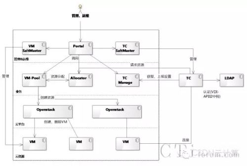 從圖中可以看出,云桌面業務邏輯從OpenStack中獨立出來,成為了VMPool,Allocator;管理層獨立開發一套面向IT運維的Portal系統,取代Horizon;云平臺可直接原生的OpenStack。