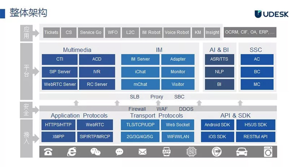 Udesk系統整體架構包括四個主要層次,由接入層、安全層、平臺層和應用層組成,如下圖所示:
