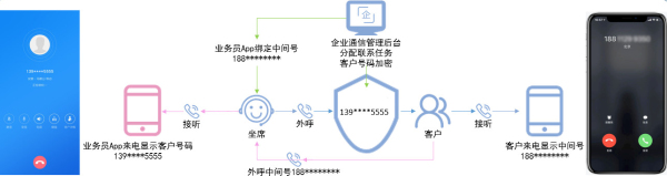 在業務員與客戶生成臨時中間號碼,完全隱藏雙方真實電話號碼,保護各方隱私,實現客戶信息與業務員想信息間的雙加密。