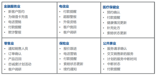 變革企業(yè)與客戶溝通方式的關(guān)鍵要素就是要從單個(gè)、最佳的供應(yīng)商處尋求整體的聯(lián)絡(luò)中心解決方案。該解決方案應(yīng)該能跨呼入及外呼渠道無縫地融合通信,滿足當(dāng)今移動(dòng)客戶的需求。如果這樣做,您的聯(lián)絡(luò)中心將打破只能通過單一渠道通信的壁壘,從全渠道外呼戰(zhàn)略中獲得極大的回報(bào),驅(qū)動(dòng)多重業(yè)務(wù)目標(biāo)。比如,企業(yè)可以設(shè)計(jì)一些外呼活動(dòng),驅(qū)動(dòng)那些具有高價(jià)值的呼入電話再次呼叫聯(lián)絡(luò)中心,同時(shí)還可以創(chuàng)建其他外呼活動(dòng),通過主動(dòng)提供信息、管理客戶預(yù)期、消除客戶聯(lián)絡(luò)企業(yè)的需求,從而降低不必要的電話呼入。不論所處何種行業(yè),企業(yè)都可以從主動(dòng)地外呼通信中獲益。以下是FrostSullivan研究公司列舉的幾個(gè)行業(yè)具體案例。