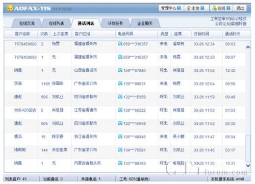 利用AOFAX獨家提供的全球域名解析技術,可在局域網或互聯網上任一臺電腦,登錄進入遠程監控程序(工作平臺),實時查看當前通話的客戶名稱、歷史通話次數、客戶區域、電話號碼、來電或呼出、開始時間、通話時長等;可以點擊客戶名稱,查看客戶詳情和歷史通話軌跡;可以對每次客戶通話添加備注,在下次來電時自動顯示。