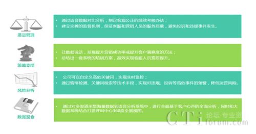 客戶互動數據整體解決方案利用語音分析技術,將呼叫中心語音通話轉化為文本信息,進行關鍵詞抽取,通過對這些文本特征進行統計及專業化分析,可以有效幫助企業優化呼叫中心數據結構、提高數據利用率,自動進行趨勢熱點分析,深挖客戶需求,定位精準營銷。并有效進行客戶流失預警分析,提前進行挽留干預;聚類客戶行為。替代性人工質檢,達到全量質檢,有效提高質檢效率降低質檢成本。挖掘客戶投訴原因,優化坐席服務水平,并進行實時高危預警,提高客戶滿意度。