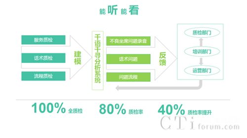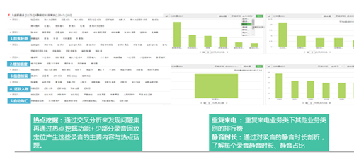 通過將所有結構化和非結構化(錄音數據、隨路數據)的數據標簽進行整合化分析,打造所有數據的可視化分析,為運營中心各類人員提供基于客戶心聲的360度視圖。數據利用率達到100%;通過對所有錄音的自動識別分析,各級質檢、運營、營銷、管理人員的工作效率提升16倍;通過對業務(話術)流程的改進,使各項營銷業務的成單轉化率提升10%;通過對坐席服務能力和業務能力的改善,使客戶流失率降低5%;通過超長通話分析、重復來電分析、靜音時長分析降低來電量和平均通話時長,轉人工來電量降低3%,平均通話時長降低10s左右。