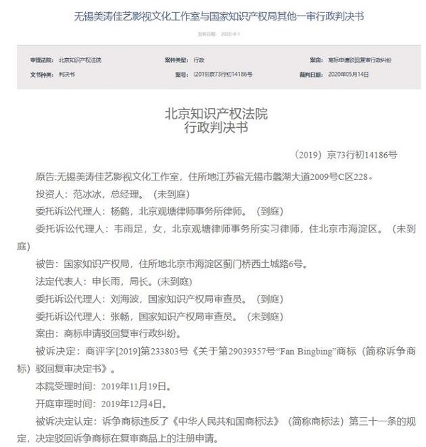 巨人網(wǎng)絡(luò)通訊聲明:本文標(biāo)題《范冰冰注冊(cè)商標(biāo)被駁回 起訴國(guó)家知識(shí)產(chǎn)權(quán)局勝訴》,本文關(guān)鍵詞 范冰冰,注冊(cè)商標(biāo),被,駁回,;如發(fā)現(xiàn)本文內(nèi)容存在版權(quán)問題,煩請(qǐng)?zhí)峁┫嚓P(guān)信息告之我們,我們將及時(shí)溝通與處理。本站內(nèi)容系統(tǒng)采集于網(wǎng)絡(luò),涉及言論、版權(quán)與本站無關(guān)。