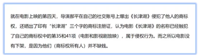 這不,電影上映沒幾天,有些媒體便報道稱“長津湖”商標已被注冊,《長津湖》電影侵犯商標權。