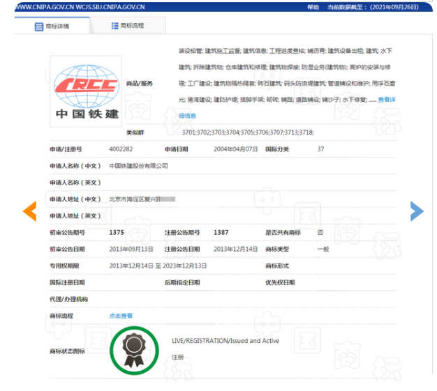 2014年5月21日,中鐵國建工程集團有限公司(中鐵國建)成立,同年6月18日,中鐵國建在第42類上首次申請注冊了“中鐵國建及圖”商標(biāo),目前該商標(biāo)還“在撤銷/無效宣告審查”中。