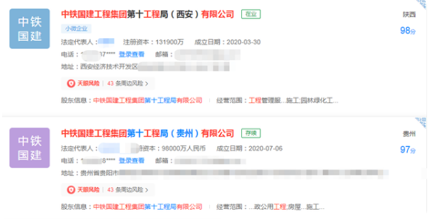 不僅如此,中鐵國建還對外投資成立了“中鐵國建工程集團有限公司”等一系列以“中鐵國建”為字號的公司,從“中鐵”一局注冊到“中鐵”十局、“中鐵”三十三局也在申請名單上,且這些公司絕大多數(shù)注冊資本均上億。