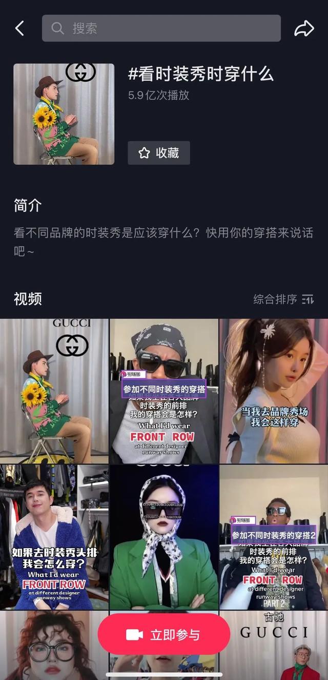 以不久前流行的#看時裝秀時穿什么 抖音挑戰為例,該挑戰激發了抖音紅人前所未有的內容熱情,話題累計錄得5.9億播放。包括駱王宇、付鵬FuPeng、Fil小白等博主都拍攝了挑戰視頻。