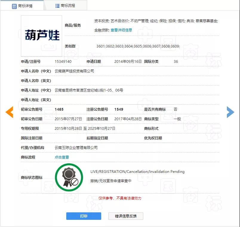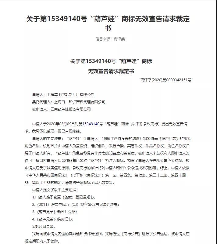近日,第15349140號“葫蘆娃”商標因侵害知名作品《葫蘆兄弟》角色名稱權益,被成功無效宣告。這次判定的依據是“葫蘆娃”角色造型美術作品曾被上海市第二中級人民法院認定由申請人享有除署名權以外的其他著作權;在無相反證據推翻的情況下,上述法院認定的申請人享有“葫蘆娃”角色造型美術作品著作權的事實,商標局予以認可。