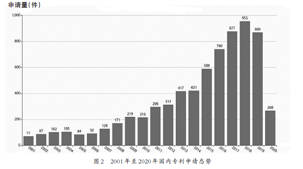 在2001年至2020年期間,國內專利申請量基本處于逐年遞增趨勢,尤其是近五年,申請量呈現井噴狀態,其中在2018年達到近千件。該增長態勢說明我國可降解塑料領域的技術發展處于成長至成熟期(見圖2)。