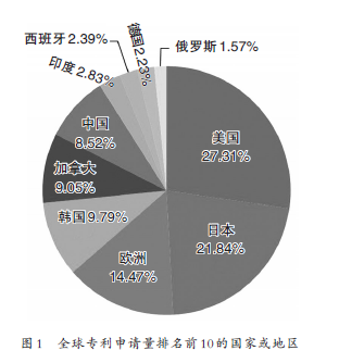 圖1為全球排名前10的國家或地區的專利申請占比情況。可以看出,申請量排名前3的國家或地區分別為美國、日本和歐洲,我國的申請量在上述3個國家或地區以及韓國和加拿大之后,排名第6。