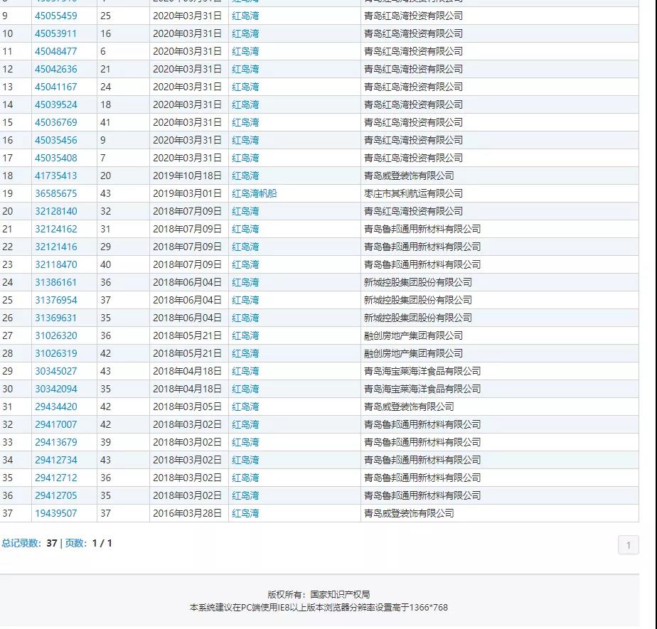 其實,“紅島灣”這個商標一直都很搶手,從國家知識產權局商標局查詢到的結果顯示,不只有魯邦公司這一家企業申請了“紅島灣”這一商標,而且魯邦公司也不是最早申請這一商標的企業。