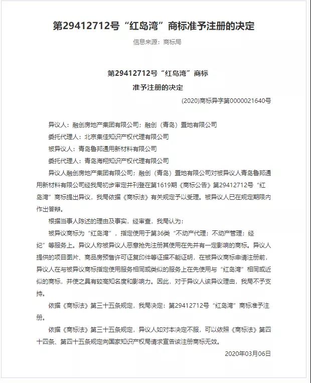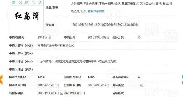 通過國家知識產權局商標局官網查詢到,魯邦公司是在2018年3月2日申請的“紅島灣”商標,初審公告日期為2018年10月13日,注冊公告日期為2020年5月14日,專用權期限為2019年1月14日至2029年1月13日,目前該商標是注冊狀態。
