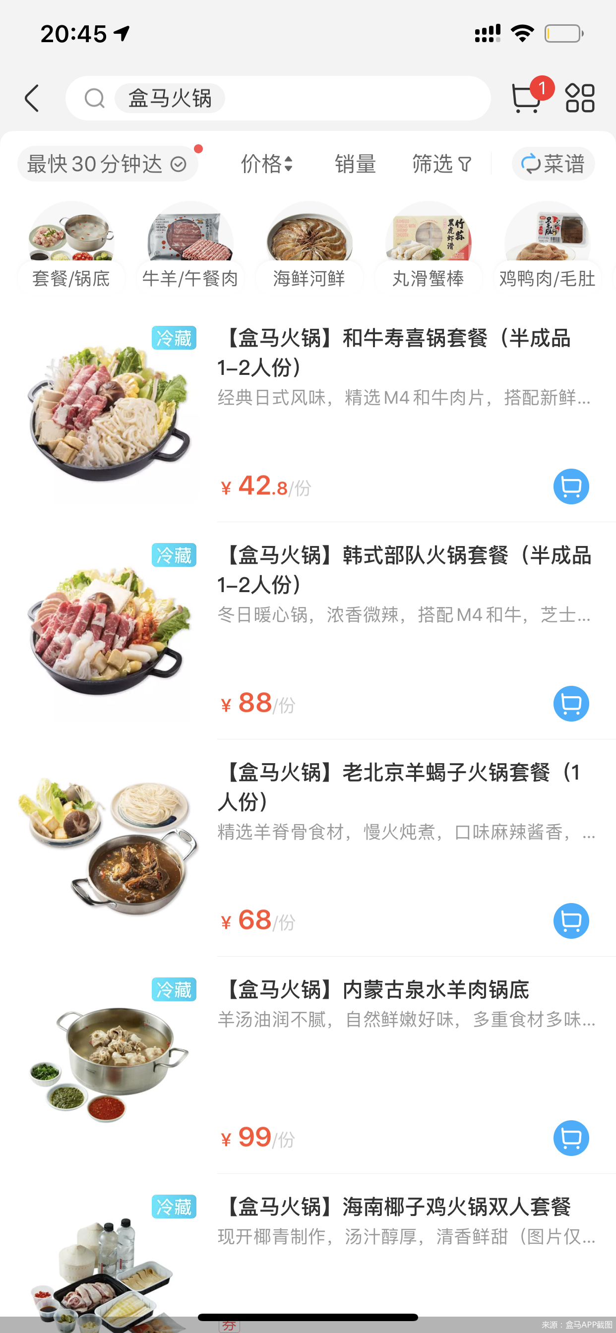 北京商報記者從盒馬APP上看到,目前在其平臺搜索“盒馬火鍋”,會出現不同的標有“盒馬火鍋”標識的火鍋套餐,價格在88-188元不等。從商品名稱來看,其火鍋產品更加突出派系特色,比如老北京羊蝎子火鍋套餐、內蒙古泉水羊肉火鍋套餐、海南椰子雞火鍋套餐等。