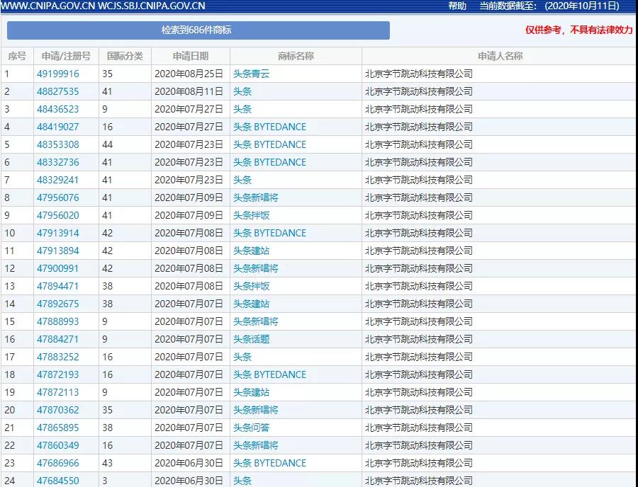而“今日頭條”、“頭條”等標(biāo)識(shí)屬于北京字節(jié)跳動(dòng)科技有限公司,就是我們所熟知的頭條app的那個(gè)公司,并在眾多領(lǐng)域申請了商標(biāo)。