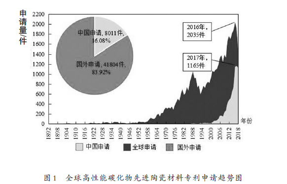 高性能碳化物先進(jìn)陶瓷材料發(fā)展順應(yīng)了《“十三五”國家戰(zhàn)略性新興產(chǎn)業(yè)發(fā)展規(guī)劃》的核心要求,廣泛應(yīng)用于飛機(jī)剎車片、反射鏡、吸波材料、防彈裝甲、核燃料、機(jī)械密封件、軸承等。我國對(duì)高性能碳化物陶瓷材料的研究雖已取得一定進(jìn)展,但因其生產(chǎn)工藝和燒成環(huán)境十分苛刻,對(duì)生產(chǎn)裝備、加工技術(shù)要求較高,導(dǎo)致我國尚未能實(shí)現(xiàn)大規(guī)模生產(chǎn),絕大多數(shù)產(chǎn)品仍停留在實(shí)驗(yàn)室階段。國家知識(shí)產(chǎn)權(quán)局專利分析普及推廣項(xiàng)目高性能碳化物先進(jìn)陶瓷材料課題組站位專利視角進(jìn)行了系統(tǒng)且全面的技術(shù)挖掘分析,希望能為行業(yè)提供一定參考。