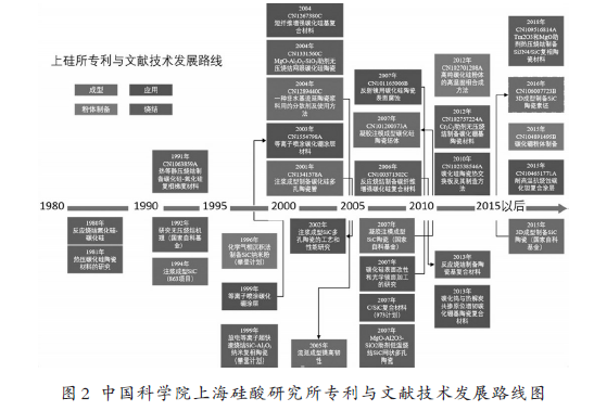 中國科學(xué)院上海硅酸鹽研究所提交的高性能碳化物先進(jìn)陶瓷材料專利申請(qǐng)總量為175件,在中外文期刊發(fā)表研究文獻(xiàn)400篇。上海硅酸鹽研究所自上世紀(jì)70年代開始開展碳化物陶瓷材料研究,早在1978年研究員江東亮發(fā)表了第一篇科技論文,但直到1991年上海硅酸鹽研究所才提交了第一件專利申請(qǐng)。隨著新材料的發(fā)展,上海硅酸鹽研究所陸續(xù)在碳化硅陶瓷反射鏡、纖維增強(qiáng)碳化物陶瓷基復(fù)合材料等方面有突破性進(jìn)展。(如圖2)