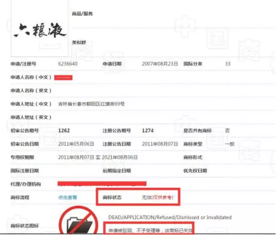 小知找了一個2007年8月23日申請的“六糧液”商標,這個商標在2011年的時候已經注冊成功,但是現在顯示的商標狀態是無效。