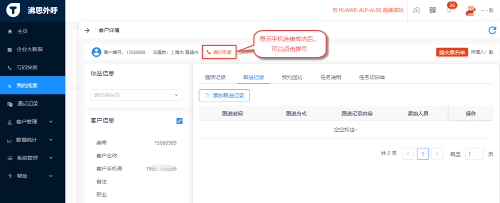 1、通過(guò)沸思電銷外呼PC版系統(tǒng)進(jìn)行撥打。可以直接操作導(dǎo)入的線索、任務(wù)數(shù)據(jù),也可以直接快撥。